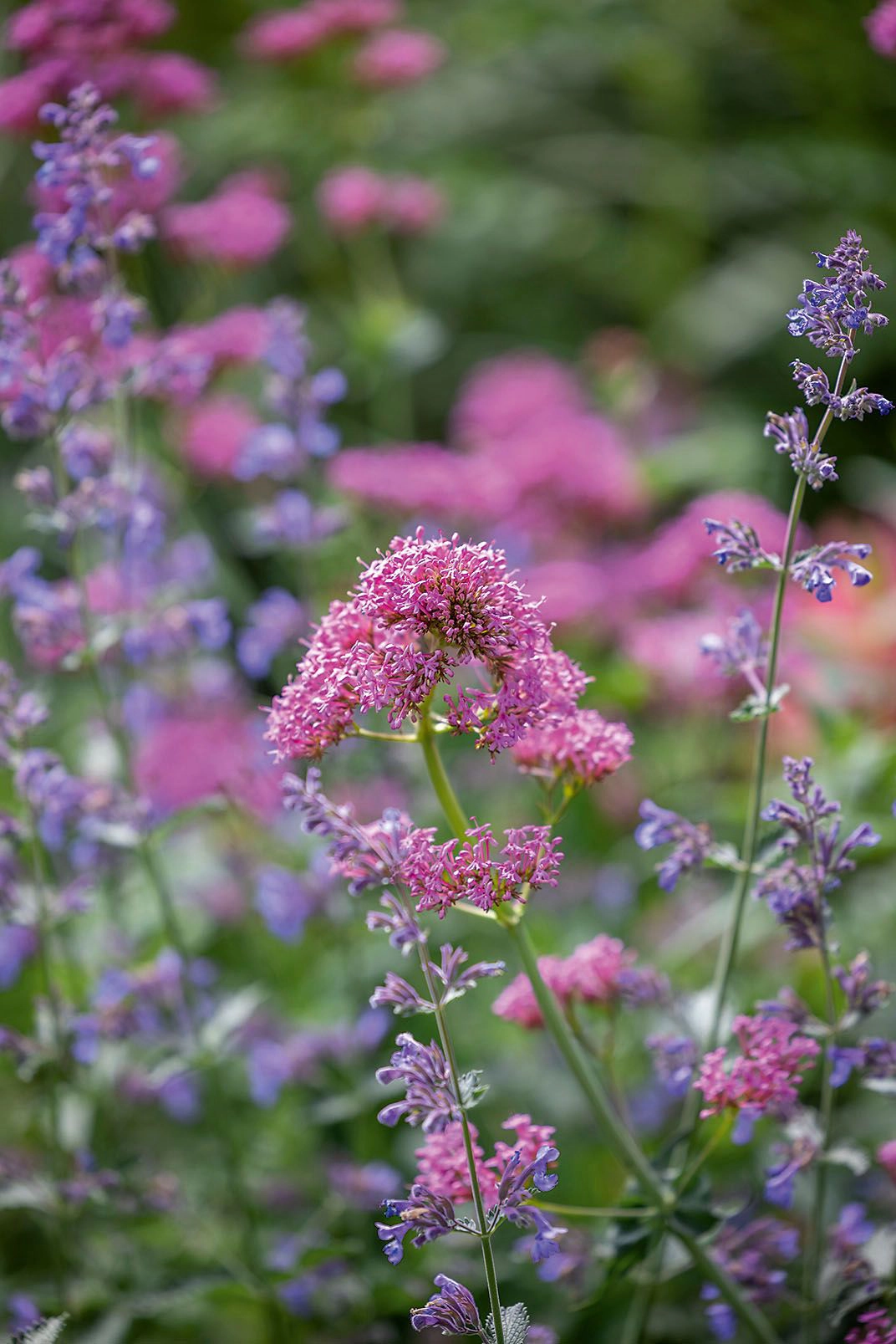 The planting combines colours, heights, and textures with flowers such as foxgloves, hollyhocks and lupins providing vertical interest. Geraniums, nepeta and erigeron border paths and create swathes at ground level.